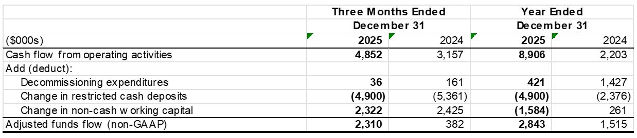 Management uses adjusted funds flow to analyze performance and considers it a key measure as it demonstrates the Company's ability to generate the cash necessary to fund future capital investments and abandonment obligations and to repay debt. Adjusted funds flow is a non-GAAP financial measure and has been defined by the Company as cash flow from operating activities excluding the change in non-cash working capital related to operating activities, movements in restricted cash deposits and expenditures on decommissioning obligations. Management believes the timing of collection, payment or incurrence of these items involves a high degree of discretion and as such may not be useful for evaluating the Company's cash flows. Adjusted funds flow is reconciled from cash flow from operating activities as follows:
