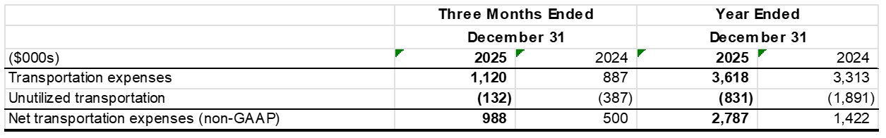 Management considers net transportation expenses an important measure as it demonstrates the cost of utilized transportation related to the Company's production. Net transportation expenses is calculated as transportation expenses less unutilized transportation and is calculated as follows: