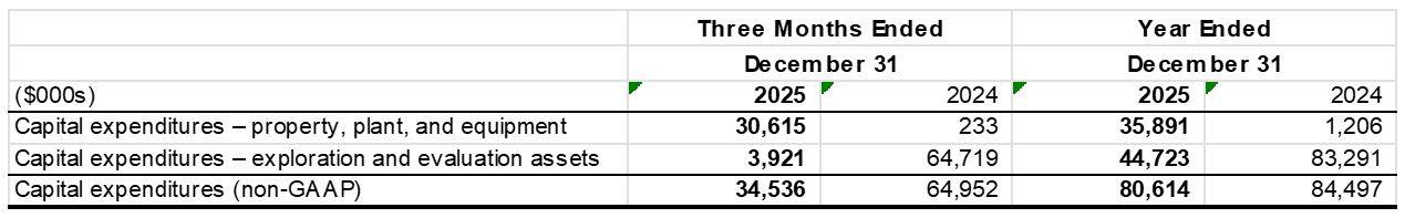Coelacanth utilizes capital expenditures as a measure of capital investment on property, plant, and equipment, exploration and evaluation assets and property acquisitions compared to its annual budgeted capital expenditures. Capital expenditures are calculated as follows: