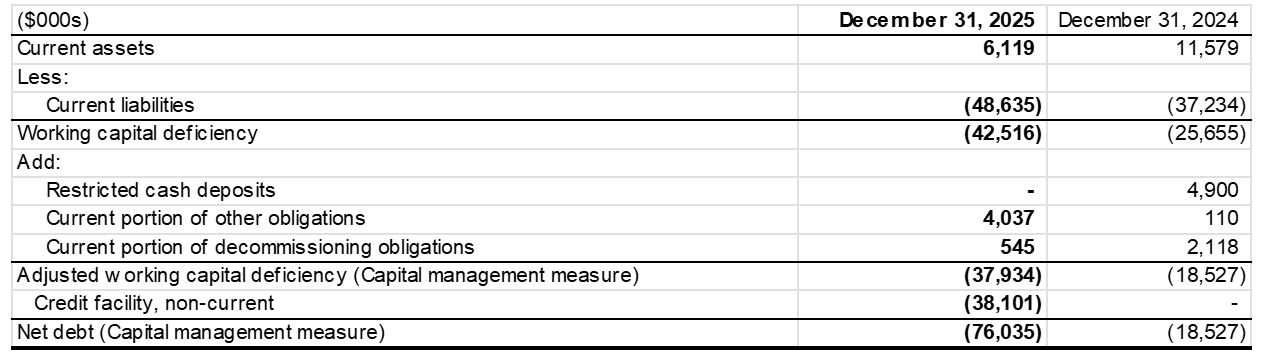 Management uses adjusted working capital deficiency and net debt as measures to assess the Company's financial position. Adjusted working capital is calculated as current assets and restricted cash deposits less current liabilities, excluding the current portion of decommissioning obligations and other obligations. Net debt includes adjusted working capital deficiency and non-current portion of the credit facility.