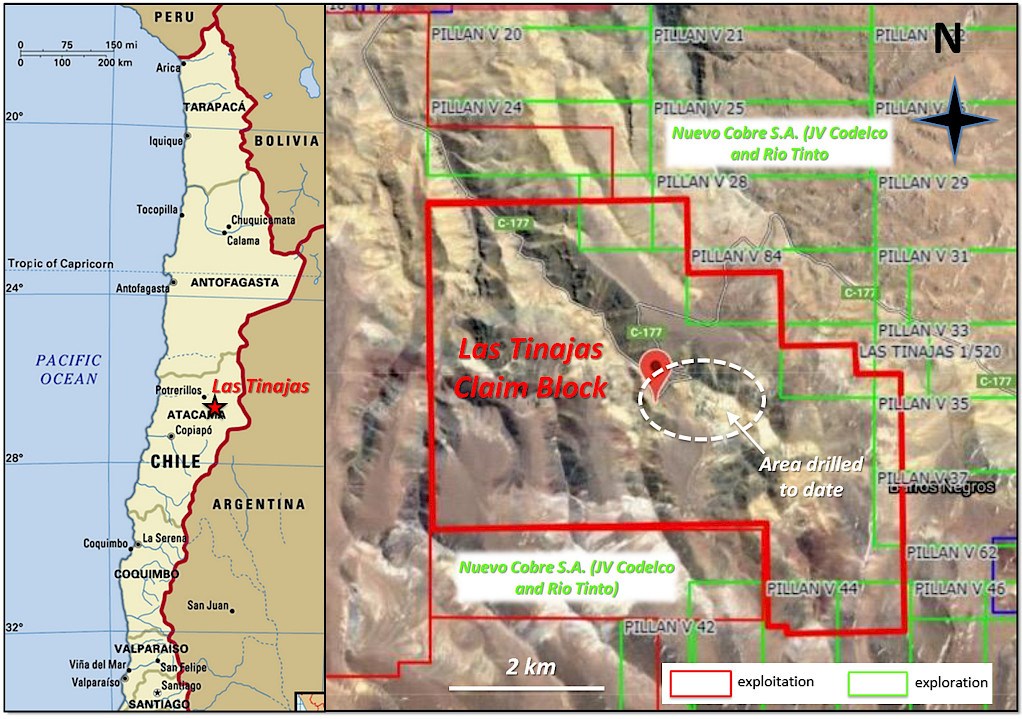 Figure 1 Location of Las Tinajas in northern Chile, and the claim configuration on satellite imagery