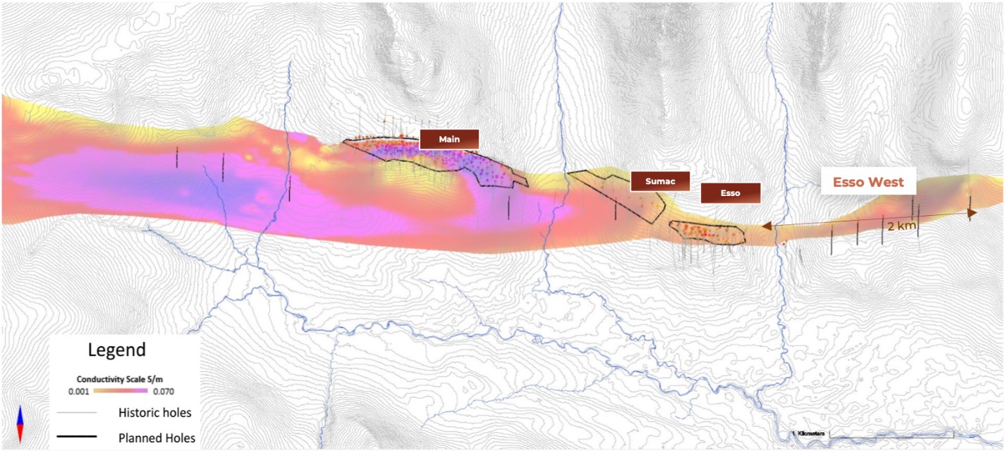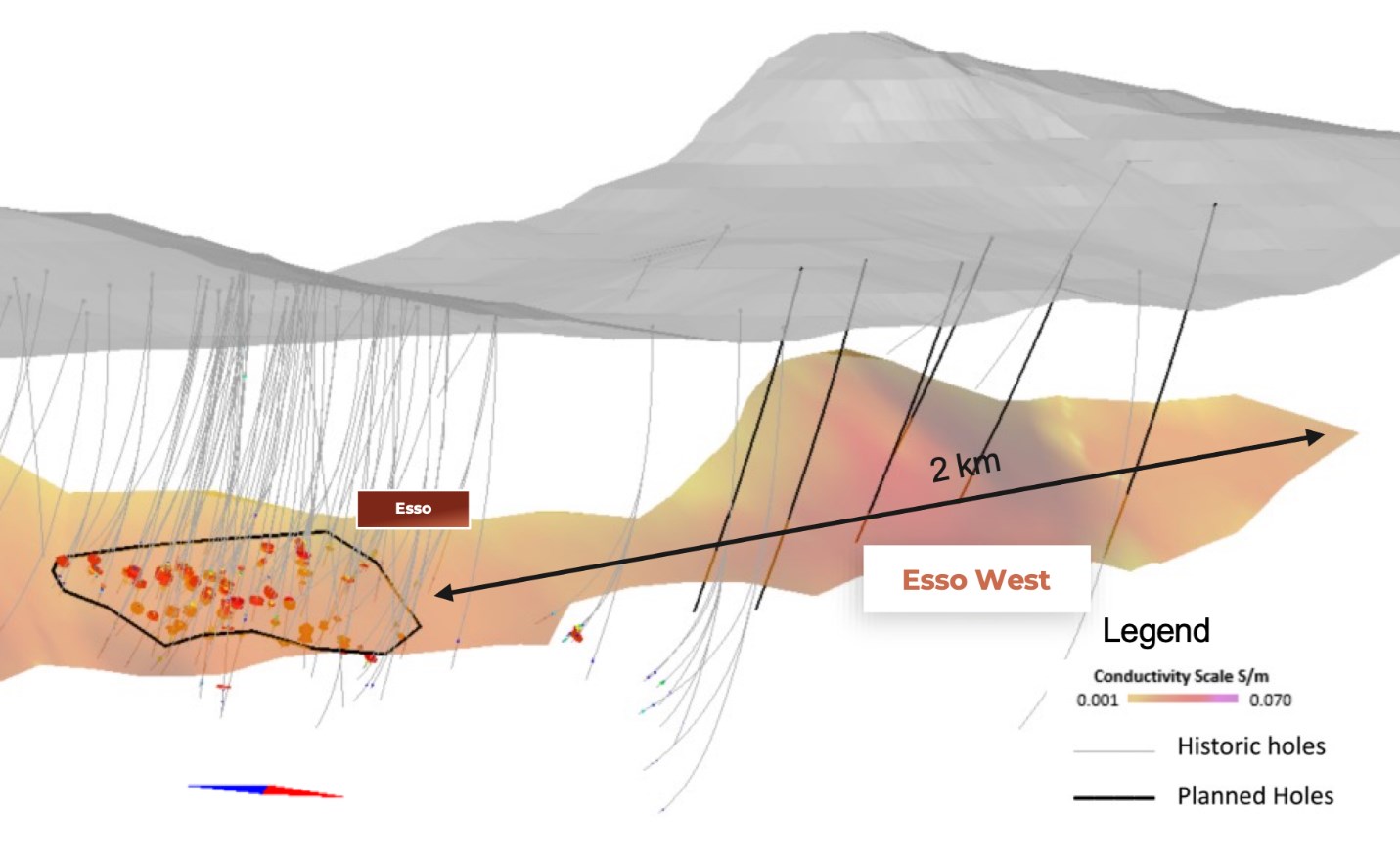 Esso West is a high priority drill target covering an area of 1,900 m strike by 500 m down dip. It is defined by coincident ZTEM, VTEM, and magnetic anomalies that lie along strike and to the west of the high-grade Esso deposit.