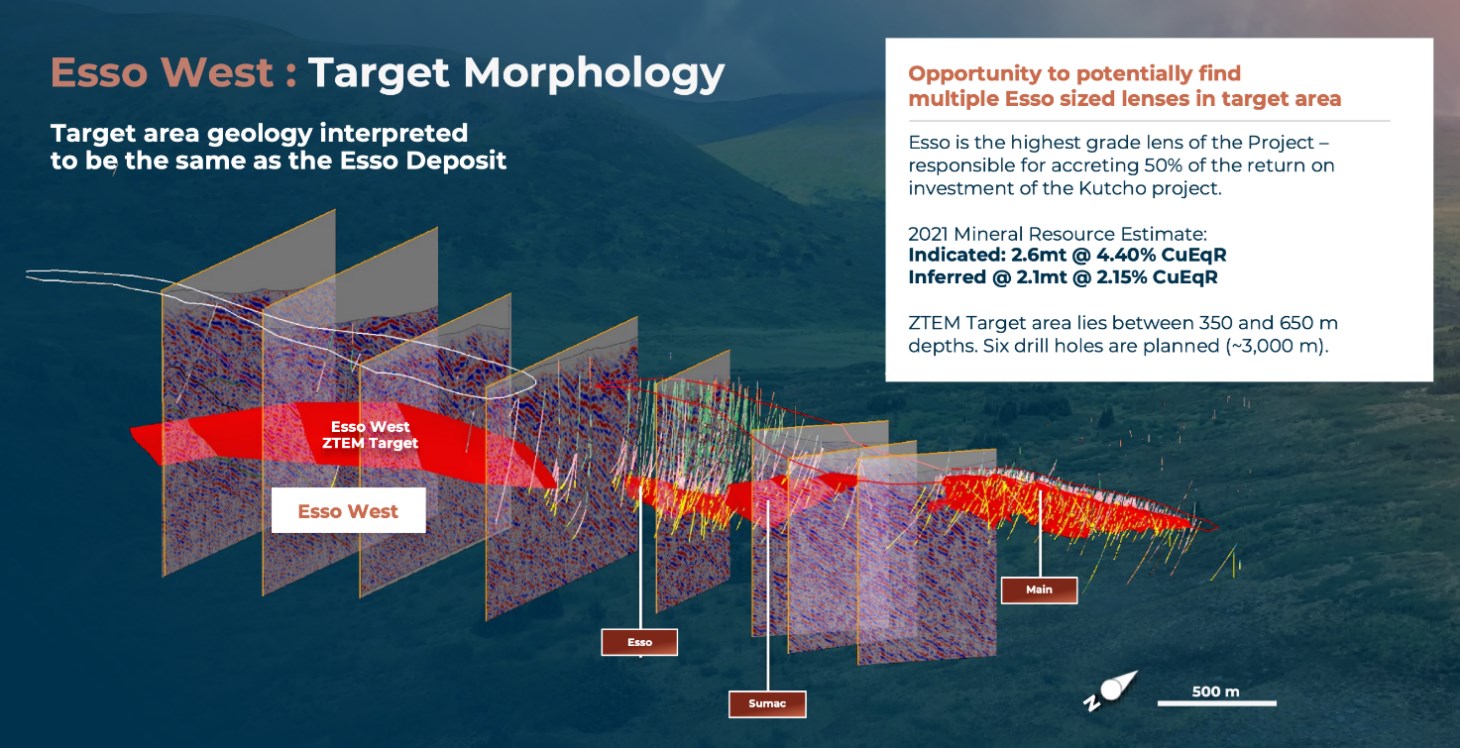 Vince Sorace, President & CEO of Kutcho Copper, stated: "Esso West is our most exciting and highest priority drill target on the Kutcho Project. Delineated by new ZTEM and seismic surveys never conducted over the target area in the past, Esso West is a highly prospective geophysical and geologically constrained target area covering nearly 1 km2. The Esso West target on its own presents the potential for significant scale and value addition to the Kutcho project."