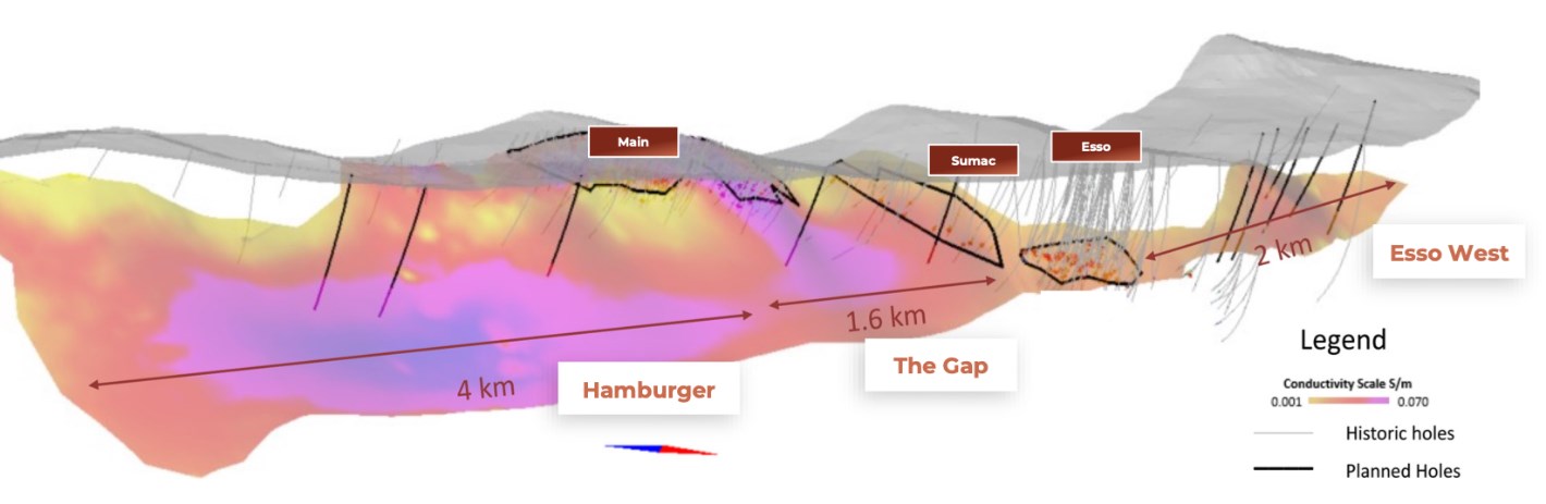 The Company is fully funded for its planned June 2026 drill program, in which it intends to drill test the Hamburger, the Gap and the Esso West targets. The entire exploration program is planned for 9-11 holes (approximately 4500 - 6000m of drilling). All drill holes will be accompanied by a down-hole EM survey which will confirm EM strength and avail target direction refinement. The Company also plans to complete soil sampling and prospecting on four early-stage targets during the summer of 2026.