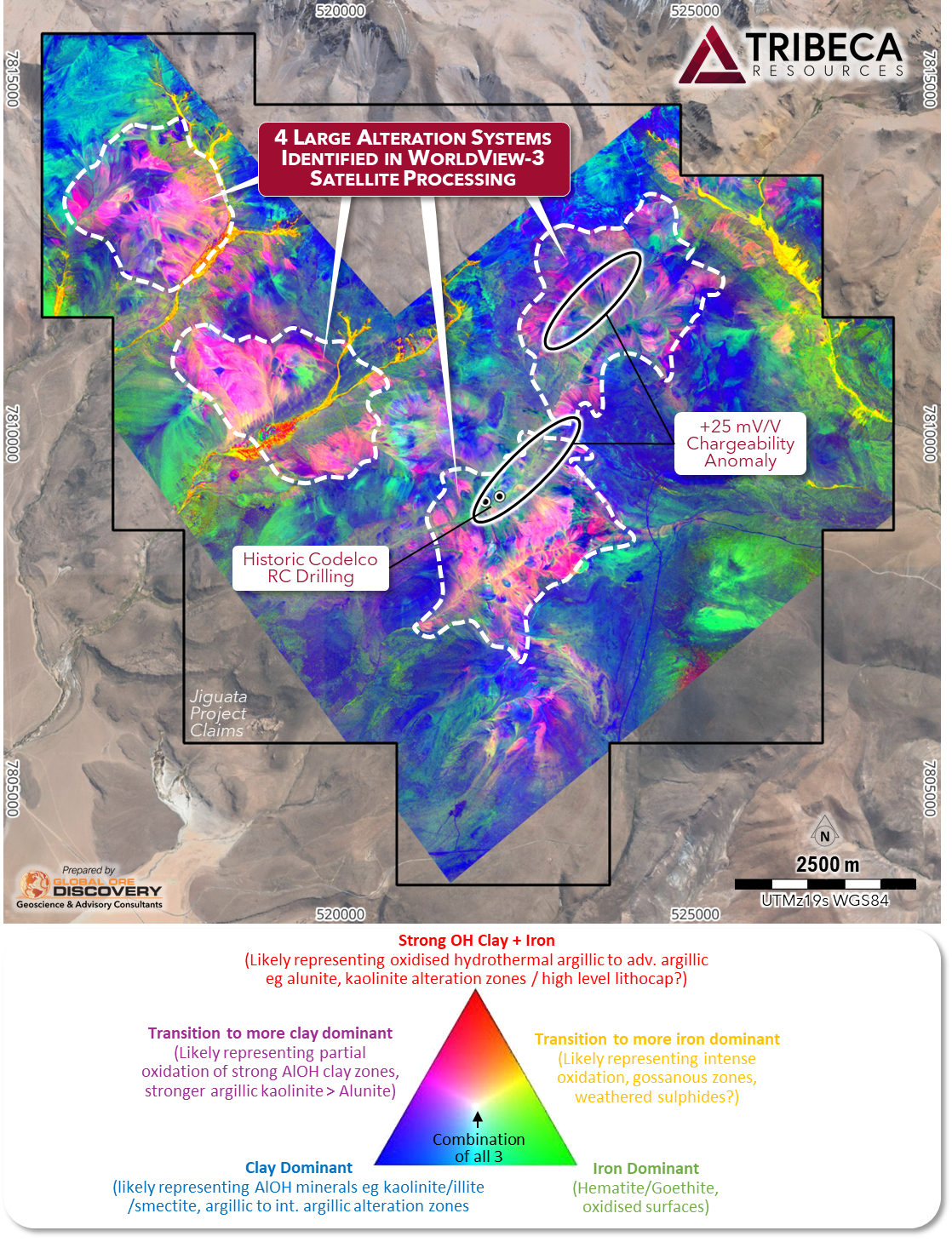 Approximately 100 square kms of Worldview 3 high resolution multispectral satellite imagery was tasked and acquired in December 2025 with cloud free data received in early January 2026. The resulting high-resolution imagery is being utilised by the mapping team for fact and interpretation maps. False colour images produced have highlighted four alteration centres aligning along regional NW and crosscutting NE structures. Initial interpretation indicates that these centres are displaying advanced argillic to intermediate argillic alteration colouring with coincident areas of strong iron oxides (gossanous), and potentially jarosite, which are consistent with the upper parts of a high sulphidation epithermal and the tops of porphyry deposits elsewhere in the Andes. These satellite‑derived alteration interpretations are preliminary in nature and require further field confirmation.