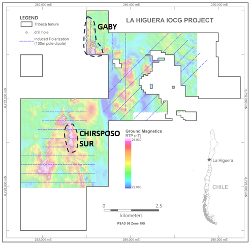 The Chirsposo Sur Target is one of five discrete targets on the La Higuera IOCG Project. It comprises an interpreted strong hydrothermal magnetite alteration system under thin gravel cover in the southern project area. Inversion of the ground magnetic data indicates the system comprises a steeply-dipping north-south oriented magnetite alteration system of 1.2 km strike length. The interpreted body is also coincident with an intense (>30 mV/V) north-south IP chargeability trend that stretches over 2.4km, along with a broadly coincident 0.5-1.0 mGal residual gravity anomaly.