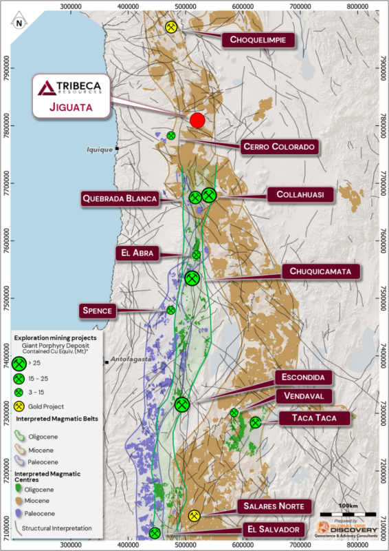 Figure 1. Location of the Jiguata Property within the Miocene Belt of northern Chile. *Deposit sizes and structural interpretation from Farrar, D. G., Tosdal, R. M., and Dilles, J. H., 2026, Lithospheric architecture of the Central Andes: Economic Geology, v. 118, no. 6, p. 1253–1280.