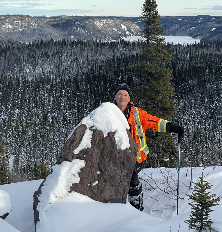 Marc Beaudoin, Surveyor, located Site 5 and crews are now splitting additional semi-massive ilmenite metallurgical samples from the pit. Photo taken December 13, 2025. Looking east, with Lac Puyjalon in the background.