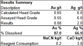 Gold dissolution recovery (amount of gold dissolved-recoverable relative to the assayed grade) from the coarser fraction, minus 10-mesh, bottle roll test of composite oxidized coarser-grained material is 87%, and silver recovery is 67%. These amounts compare favourably to gold recoveries ranging from 75% to 90% and silver recoveries around 65% for bottle roll tests conducted on fine-grained (minus 200-mesh) oxidized material, with most of the gold and silver dissolved/recoverable within the first 12 hours. Considering the coarse-grained nature of the material tested, cyanide consumption (0.2 kg/t) is considered low, while CaO consumption (3.8 kg/t) is considered on the higher end of average.