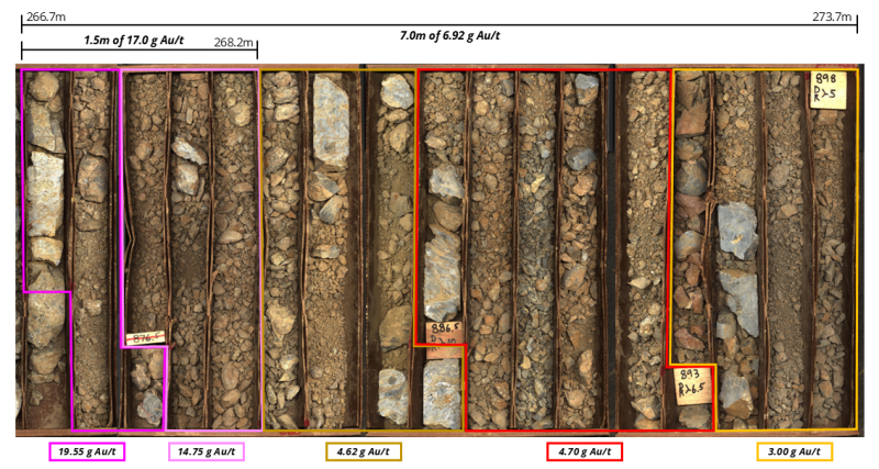 The SSD Zone interval presented in Figure 3 above is a typical example of elevated gold grades in conjunction with deep oxidation, pervasive shearing breccia associated with a blind thrust. Due to their high-grade nature, samples were tested a second time by the operator with those assays confirming the original results.