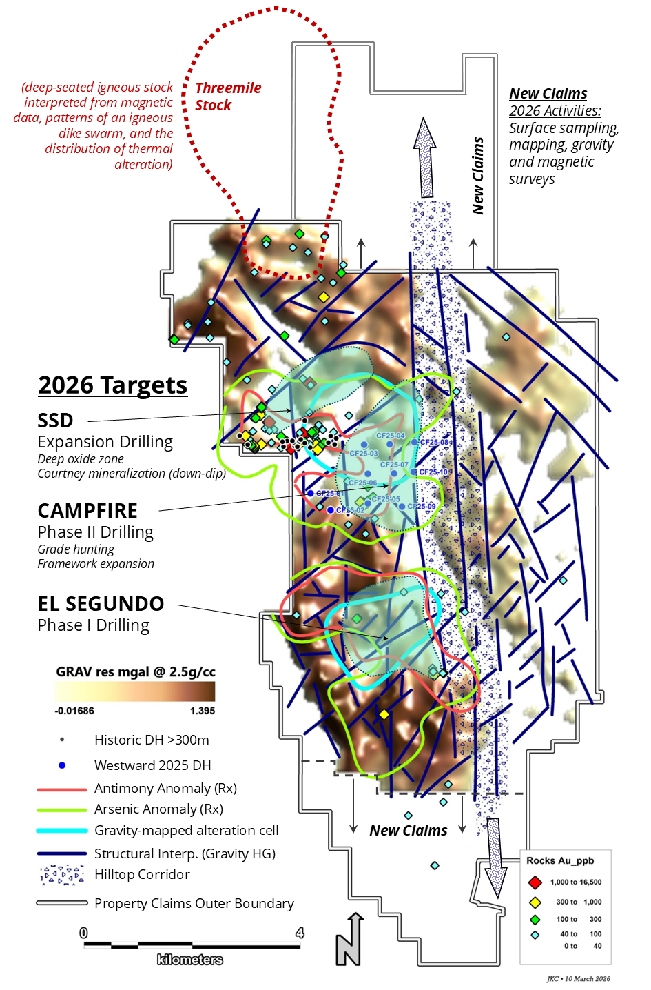 SSD was originally identified several years ago by the Company through a detailed investigation of legacy drill hole data; it is a separate and unique zone of gold mineralization that lies beneath the Courtney Zone, an area of shallow gold mineralization that was the focal point of the vast majority of historical drilling by previous operators. Westward subsequently expanded upon SSD with drilling in 2022 and 2023, and now with the benefit of large-scale systematic programs completed since then – including 1:5000 surface mapping, relogging of legacy RC and core drill holes, soil and rock-chip sampling, gravity and magnetic surveys – this target has been deemed a top priority for follow-up in 2026. SSD also represents the target zone that is most proximal to the recently-identified Threemile Stock, a deep-seated intrusive centre interpreted from magnetic data, dike swarms, and mapped/logged thermal alteration (see press release dated March 26, 2026, for additional details) . Importantly, SSD earthwork is already permitted under the Company’s existing Exploration Plan of Operations (“EPO” ) with the U.S. Bureau of Land Management (“BLM” ), allowing for significant trench, road, and drill-pad construction flexibility – additional permitting updates for the entire 2026 drill program are outlined below. Details related to 2026 drilling plans at the other two target areas (Campfire and El Segundo) will be provided in subsequent press releases (see Figure 1 below).