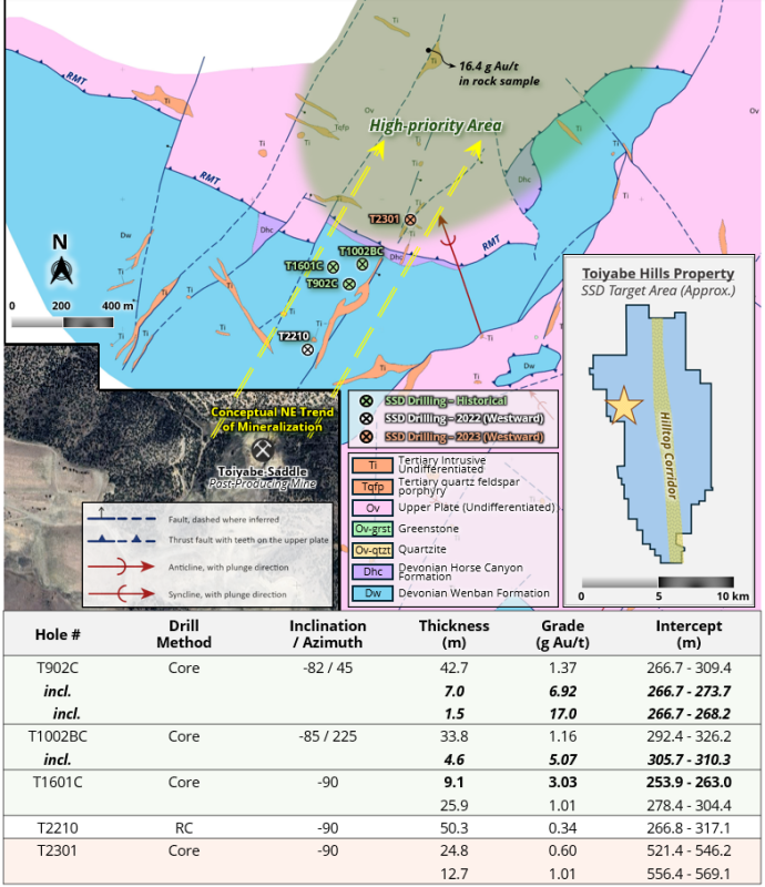 SSD and the Courtney Zone represent the only areas of the Property where the following coincident observations have been made: i) an abundance of quartz porphyry dikes that host strong silica alteration; ii) altered quartz porphyry dikes and lamprophyre dikes close to one another (with near-surface gold grades of up to 21.8 g Au/t in drilling samples); iii) upper-plate siliciclastic rocks structurally-emplaced within lower-plate carbonate rocks along a blind thrust / duplex; and iv) silicification as either carbonate replacement or as quartz veins, with a strong correlation between gold mineralization and silica.