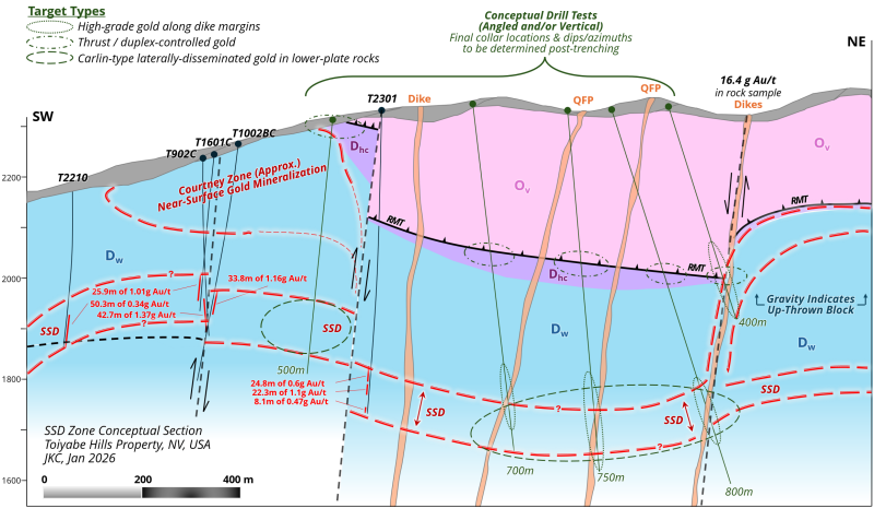 Significant gold intervals reported in historical SSD drilling ranged from 9.1 to 50.3 metres thick at depths of 255 to 570 metres (see Figure 2 below), with notable intervals grading between 0.34 and 3.03 g Au/t (and sub-interval grades of up to 17.0 g Au/t). Mineralization remains open in all directions, particularly to the northeast and northwest which will be a focus for 2026 trench sampling, surface mapping, and drilling.