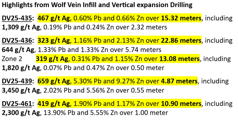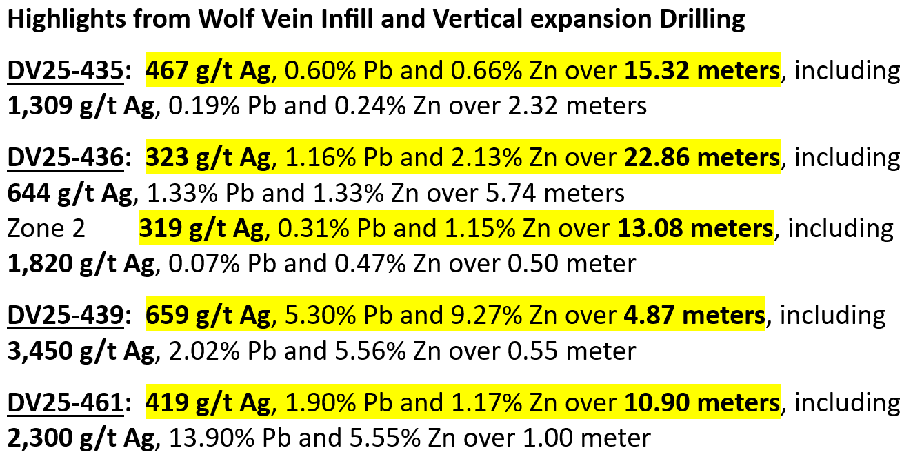 “In addition to the successful infill and expansion of the Wolf Vein, the discovery of silver-bearing mineralization similar to the Torbrit Deposit is a very significant step in connecting the Wolf Vein with Torbrit, located over one kilometer to the south,” stated Shawn Khunkhun, President and CEO of DV in the January 20 press release.
