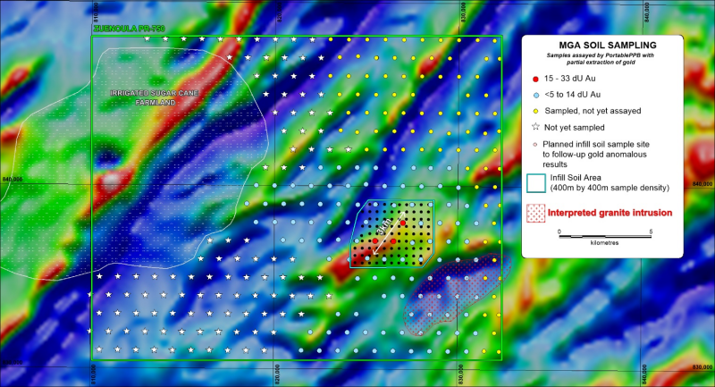 Soil Sampling (PortablePPB): Initial broad-spaced (1km by 1km) soil sampling supported by rapid field analysis of samples using the PortablePPB analytical technique is being undertaken so that gold anomalous trends can be identified and infill sampling conducted to define drill targets before the field crew is demobilized. The highly professional and experienced consulting group SEMS Exploration Services has been contracted to conduct soil sampling and assay the samples using their PortablePPB mobile laboratory