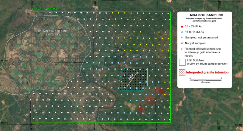 | The 1km by 1km offset soil sample pattern over the permit area, excluding areas of irrigated sugar cane, is considered an effective technique for identifying and delimiting gold anomalous trends, which are then followed up with higher density sampling, with 400m by 400m as the next phase and then further infill as required to define well constrained drill targets.