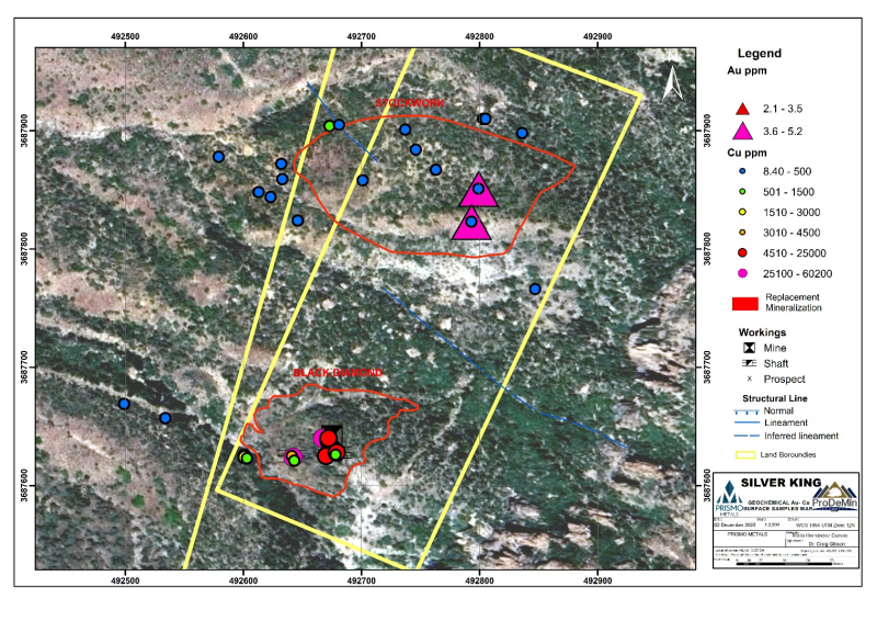 Vancouver, British Columbia – TheNewswire - December 3rd, 2025 – Prismo Metals Inc. (“Prismo ” or the “Company ”) (CSE: PRIZ) (OTCQB: PMOMF) is pleased to announce it has received assay results for samples recently taken at the Silver King Project from two exploration targets located on the east side of the property, namely the Black Diamond replacement target and the newly named Crown porphyry intrusion target (Fig. 1).