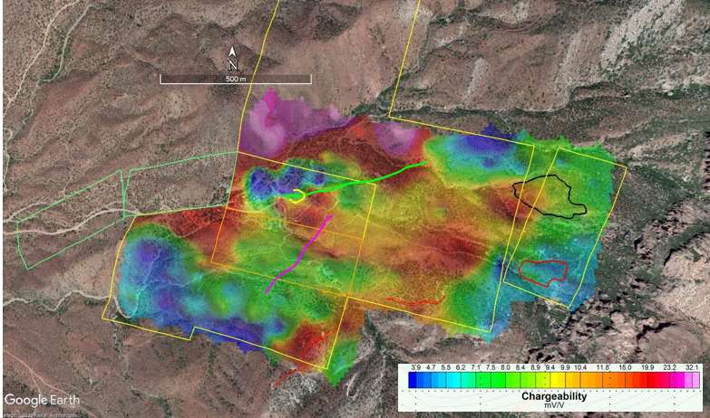 Figure 4. IP chargeability map showing exploration targets: yellow line-Silver King glory hole,