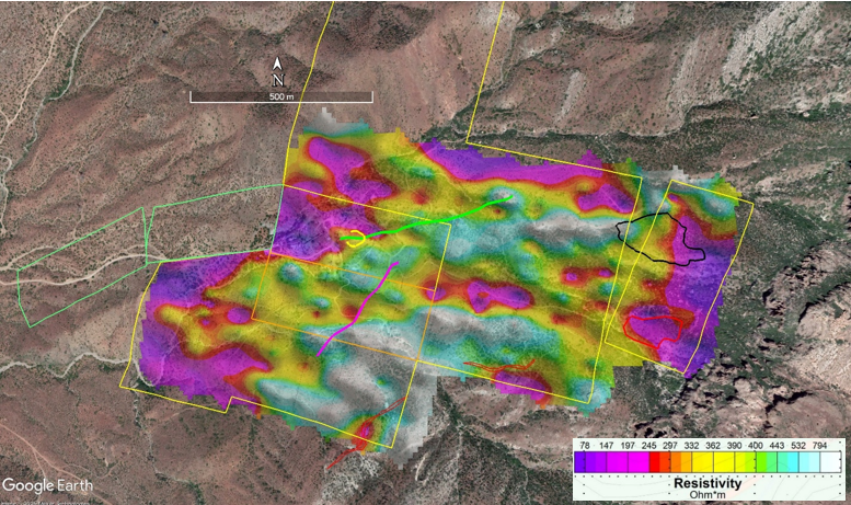 Figure 3. IP resistivity map showing exploration targets: yellow line-Silver King glory hole,