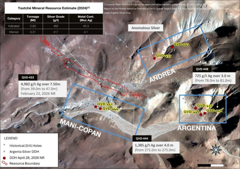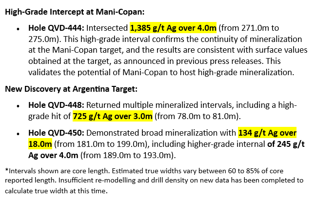 Notably, drill hole QVD-444 at Mani-Copan intercepted 1,385 g/t Ag over 4.0 meters , successfully validating high-grade results previously identified from surface samples (see press release dated February 23, 2026 ).