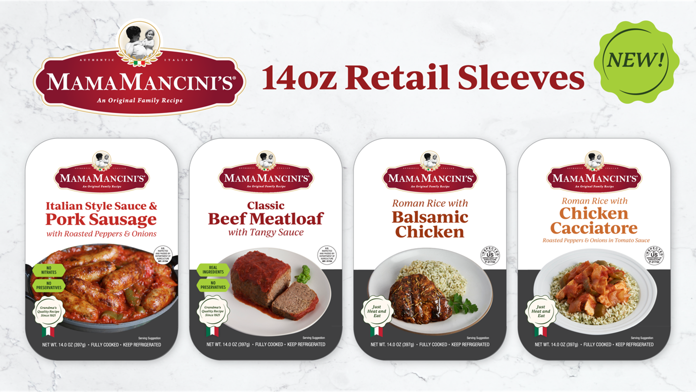 The four new sleeve products are Roman Rice with Chicken Cacciatore, an entirely new product, as well as three popular, existing products previously only available ‘behind the glass’ – including Italian Style Sauce with Pork Sausage and Roasted Vegetables, Classic Beef Meatloaf with Tangy Sauce and Roman Rice with Balsamic Chicken. These four new items join MamaMancini’s existing line of sleeves which include, among others, Five-Cheese Stuffed Beef Meatballs, Turkey Meatballs and Gluten Free meatball varieties.