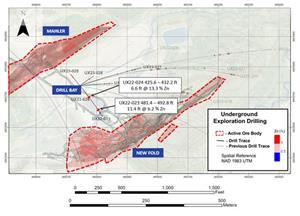The mineralization intercepted in the initial four holes of the program (reported January 31, 2023) has been successfully tested along a modeled structural horizon between the Mahler and New Fold ore bodies. Five of the subsequent holes intercepted this mineralized horizon along strike as well as up and down dip. Drilling will continue to target this mineralized zone to further understand its relationship to the neighboring ore bodies.