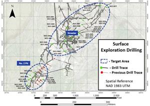 Surface drilling was successful in intercepting extensions of historically mined areas, and in testing and validating the modeled extent and scale of historic mining activity. Drilling will continue with a full mineral resource estimate update planned for Q1 2024.
