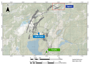 Figure 1: Location map showing the relative position of the Lower Mahler drilling to ESM's #4 shaft.