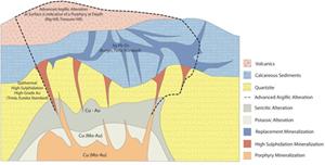 Figure 3: Generalized conceptual deposit model of a high sulphidation epithermal porphyry system