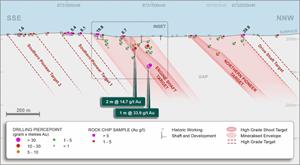 Long section interpretation showing the Southern Pioneer and Main Shaft targets, historic shafts, previous drilling pierce points (Appendix 2-4)2, 3,4, 7 from broad spaced drilling and recent rock chip results. Targets are high-grade NNW plunging shoots.
