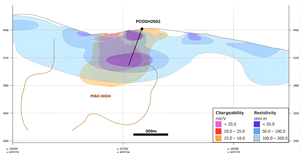 Figure 5 – Pucarini Diamond Drill Hole #2 in Cross section - IP High Chargeability/ Low Resistivity Anomalies Coincident with a High Magnetic Susceptibility Anomaly