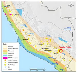 Pucarini is located within the Southern Peru Miocene Mineral Belt, which hosts numerous epithermal gold (“Au”) and porphyry copper - molybdenum (“Cu-Mo”) deposits. The Project exhibits a large-scale hydrothermal alteration footprint with high-sulphidation epithermal Au type mineralization, similar to those of neighbouring and regional deposits in the Puno region of Southern Peru.