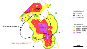 Forte has identified a cohesive Au geochemical anomaly in rocks and soils that spans 1,200 m by 600m, supported by a large 1,500 m by 600 m high chargeability anomaly. This is also coincident with a deep-rooted high magnetic susceptibility anomaly that potentially outlines a Au-Cu-Mo porphyry system at depth. Lower levels of anomalous Cu and Mo geochemistry in rocks and soils dominate the main target zone lending more conviction to a potential deeper porphyry target. Together, these datasets outline a robust, untested high-sulphidation epithermal Au target overprinting a potential porphyry Au-Cu-Mo target at greater depth.