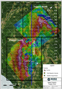 Radar Project’s Trapper Zone depicting a 3+ km Total Magnetic Intensity (TMI) anomaly from the 2025 ground survey and the oxide layering trend. The Trapper Trail (in black) will be the target of the planned 15,000 m diamond drilling program aimed at establishing Saga’s maiden mineral resource estimation.