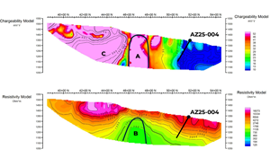 Induced polarization chargeability and electrical resistivity images showing subsurface features suggestive of a porphyry-style mineralizing system. A vertically oriented zone of elevated chargeability (A) coincides with a zone of reduced resistivity. (B) This combination of responses is commonly associated with rocks containing higher concentrations of sulphide minerals, which can both increase electrical conductivity and hold an electrical charge. This is a compelling drill target. A broader zone of elevated chargeability is also present at (C) and represents a priority target for follow-up exploration. Drill hole AZ25-004 was completed approximately 350m from the anomaly (A).