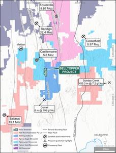The Belltopper Gold Project (‘Belltopper’) is located 120 km northwest of Melbourne and approximately 60 km south of Agnico Eagle’s Fosterville Gold Mine in the Bendigo Zone, an area with historical gold production of more than 60 million ounces. Kaiser Reef Limited’s Maldon processing plant is located some 40 km to the northwest of the project area and Alkane Resources Limited’s Costerfield’s operation is located some 50 km to the northeast of Belltopper.
