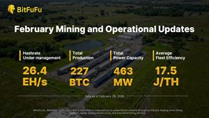 As of February 28, 2026, BitFuFu managed 26.4 EH/s in hashrate, produced 227 BTC, operated 463 MW of total power capacity, and achieved an average fleet efficiency of 17.5 J/TH.