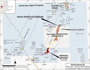 The Company is pleased to provide analytical results for one surface diamond drill hole (“DDH”) and 4 underground DDHs, which were part of the 2024 and 2025 in-fill drilling programs at the Hugo North Extension (“HNE”) deposit on the Entrée/Oyu Tolgoi joint venture property (the “Entrée/Oyu Tolgoi JV Property”) in Mongolia. Regional exploration results are also provided, including analytical results for nine DDHs from the 2025 regional drilling campaign testing several targets on the Shivee Tolgoi and Javkhlant mining licences. All work was completed by the Company’s joint venture partner OT LLC, with expenditures borne by OT LLC and Entrée in proportion to their participating interests in the Entrée/Oyu Tolgoi JV.