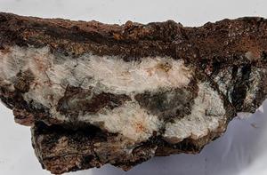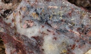 Figure 7: Saccharoidal quartz vein with silicified and iron oxide-stained wall rock fragments. Note flecks of dark grey, lustrous, secondary silver minerals.