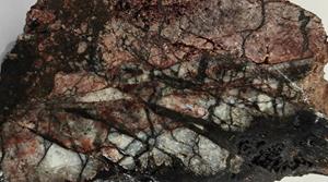 Figure 2: Fractures vein comprising clasts of saccharoidal quartz, in part grey and sulphidic, with hematite and goethite fracture fill.