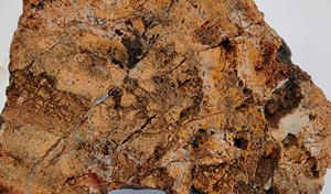 Figure 4: Pervasively limonite altered rock with iron-oxide boxwork after sulphide, chalcedonic quartz flooding and thin grey sulphidic quartz veinlets.