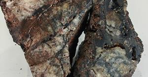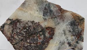 Figure 5: Pervasively silicified and fractures fragments of tuffaceous wallrock, with hematite and goethite fracture fill, forming part of a saccharoidal quartz vein which is partly dark grey and sulphidic.