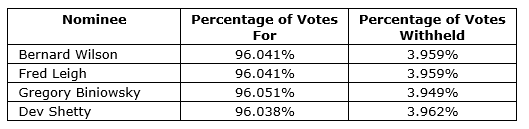 Detailed results of the vote for the election of directors held at the meeting are set out below. A total of 16,596,310 common shares were voted in connection with the meeting, representing approximately 10.39 per cent of the issued and outstanding common shares of the company.