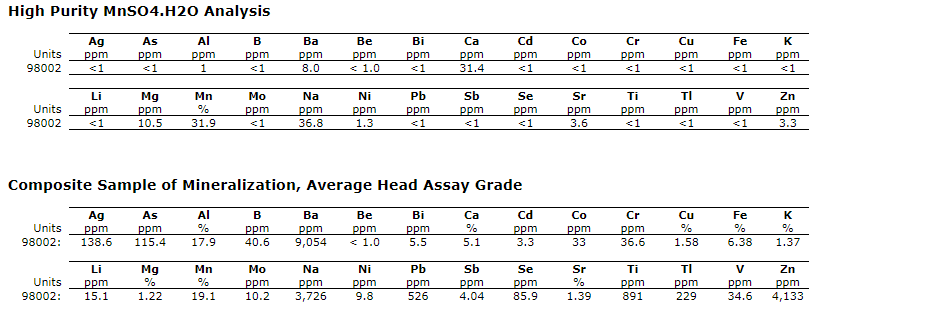 After dissolution of the mineralization, and following each purification step, all solutions were analyzed by ICP-OES. After all trace impurities were removed, solutions were subjected to evaporative crystallization yielding MnSO4.H2O (HPMSM) crystals. The solution which was evaporated to produce the crystals was analyzed (prior to crystallization) to confirm that there were no elements in solution which were above the allowable levels for HPMSM listed impurities. Crystals were then dried for 48 hours to remove residual water. To verify purity, crystals were dissolved in water and reanalyzed. These analyses confirmed that the crystals were within spec for all listed elements.