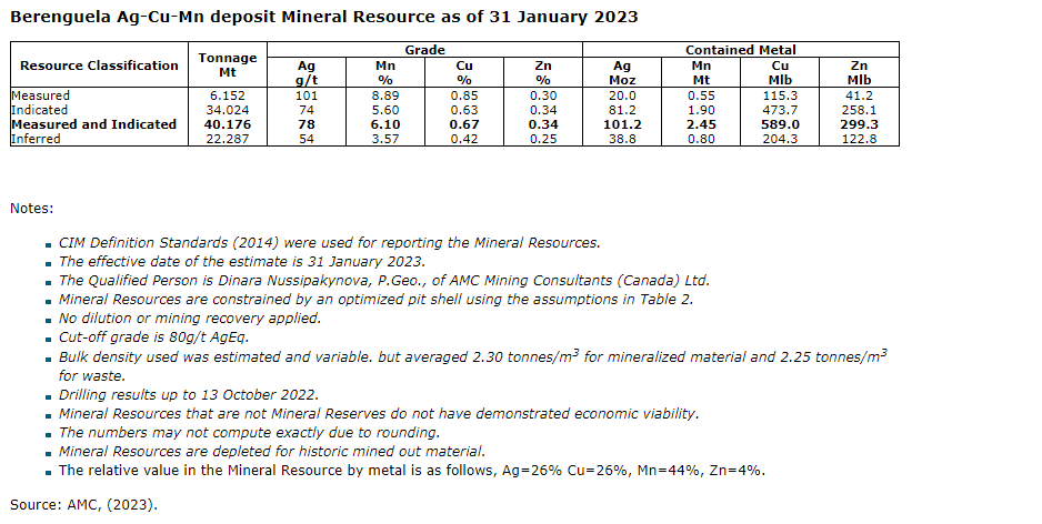 In March, 2023, Aftermath published an updated resource estimate for Berenguela which included manganese in addition to substantial silver and copper resources across the measured, indicated and inferred categories. Mineral resources are stated at a cut-off grade of 80 grams per tonne silver equivalent. The relative value in the mineral resource by metal is as follows, Ag equals 26 per cent, Mn equals 44 per cent, Cu equals 26 per cent, Zn equals 4 per cent, however the estimate used pricing for agricultural grade MnSO4 which trades at a considerable discount to battery grade manganese sulphate. The model is depleted for historical mining activities.