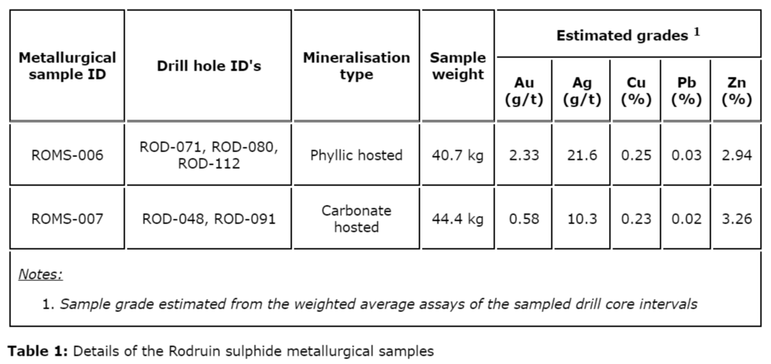 - Two composite samples representing the main sulphide mineralization types at Rodruin underwent preliminary metallurgical test work investigating the potential to produce saleable copper and zinc concentrates. The composite samples were prepared from selected diamond drill half-core intervals.