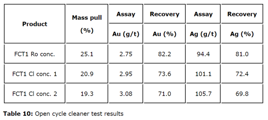 A single cleaner test was carried out to determine the sample's amenability to increasing the flotation concentrate gold and silver grades. Results of the open-cycle cleaner test results are shown in an attached table.