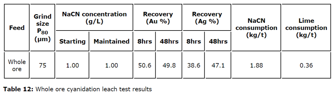 - Whole-ore cyanide leach test work showed that 49.8 per cent of the gold was recoverable by cyanide leaching. Metal recoveries of 47.1 per cent and 26.1 per cent were also obtained for silver and copper, respectively.