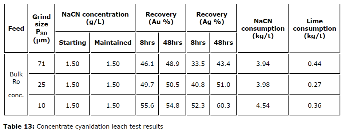 - Bulk concentrate cyanide leach test work showed that a gold recovery of 54.8 per cent was achievable at a particle size of 80 per cent passing 10 micrometres. Silver and copper recoveries of 60.3 per cent and 47.0 per cent were achieved, respectively.
