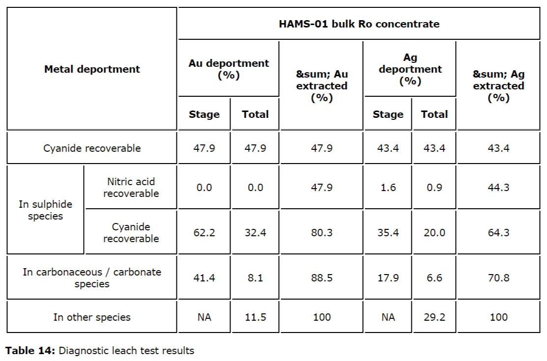 Diagnostic leaching was undertaken to evaluate the gold and silver deportment across the bulk flotation concentrate and demonstrated significant gold deportment in sulphide species, which hosted 32.4 per cent of the total gold from the flotation concentrate. A summary of the diagnostic leach test is shown in an attached table.